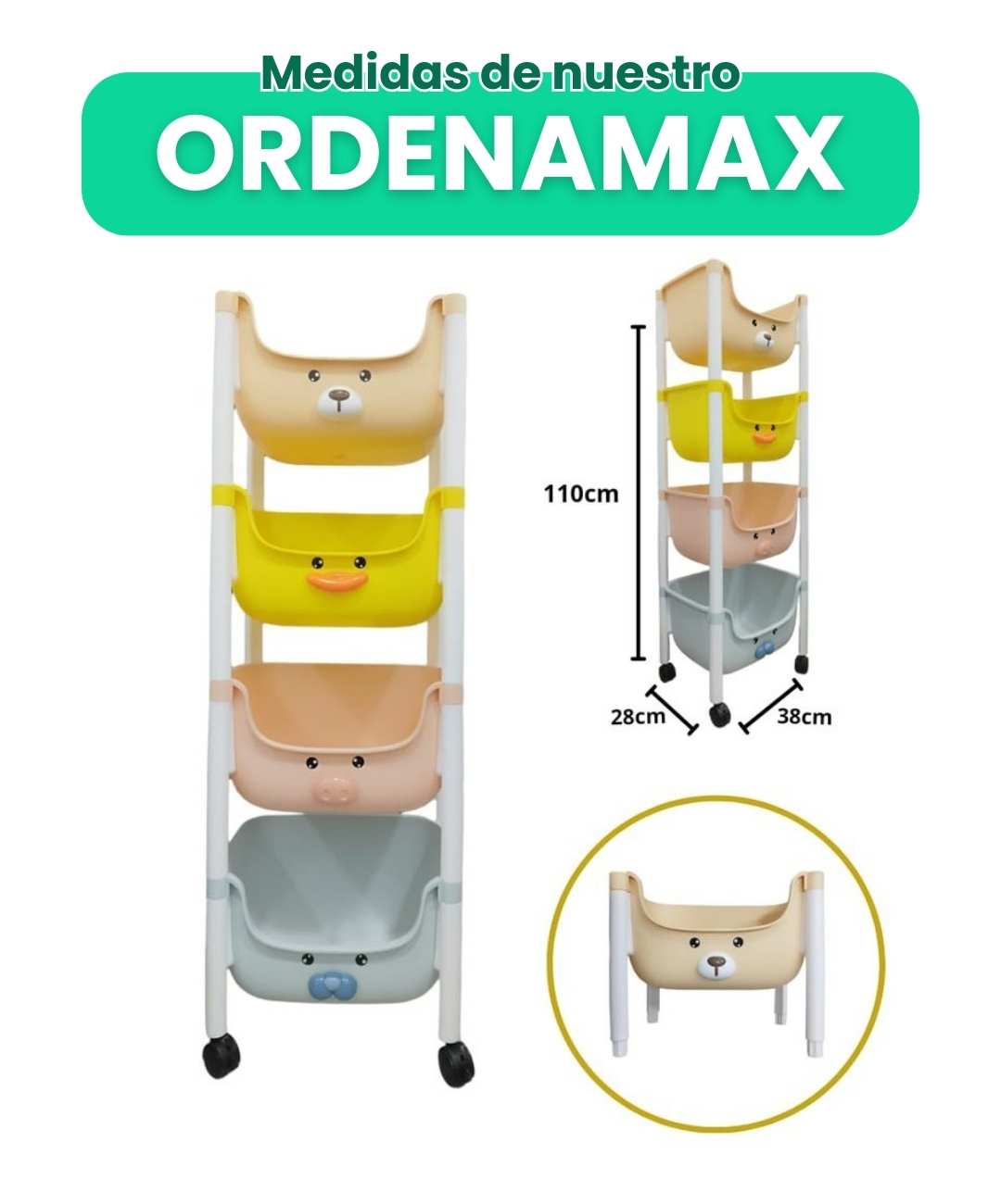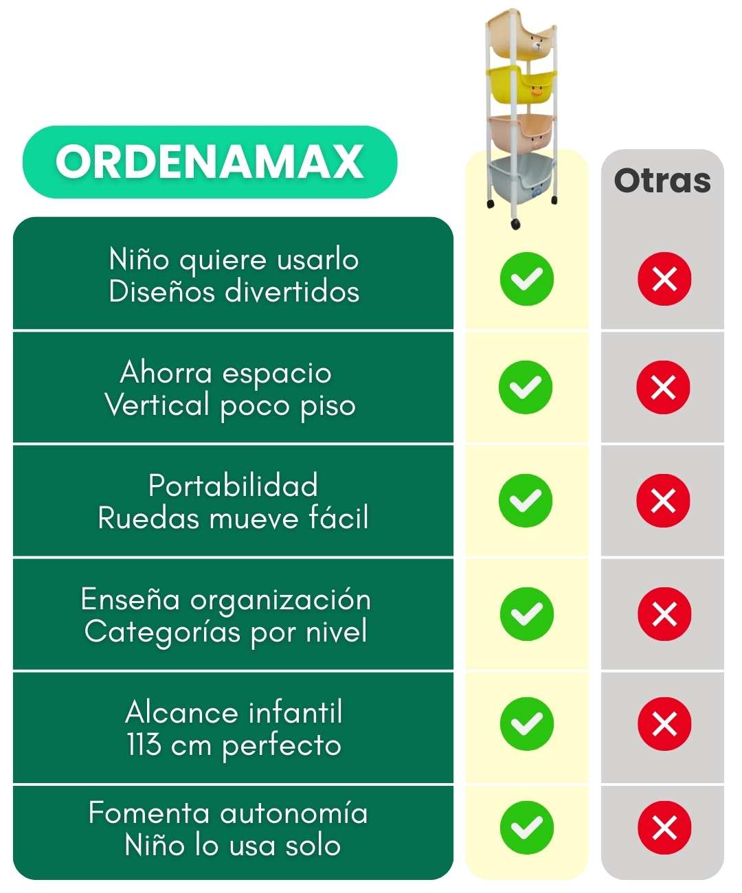Diseñado para niños desde 2 hasta 8 años. La altura ergonómica permite que incluso los más pequeños alcancen los compartimentos inferiores de forma independiente.