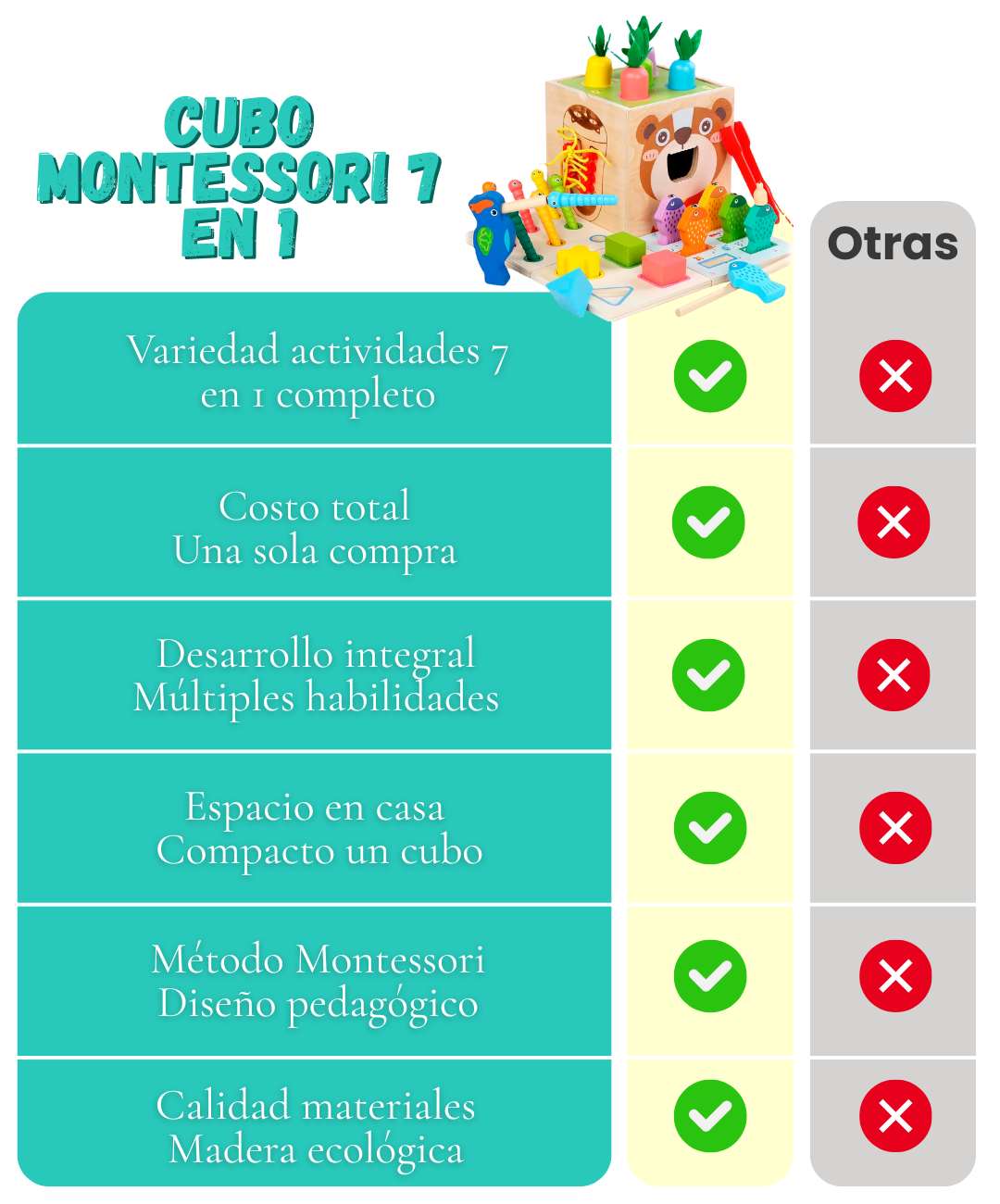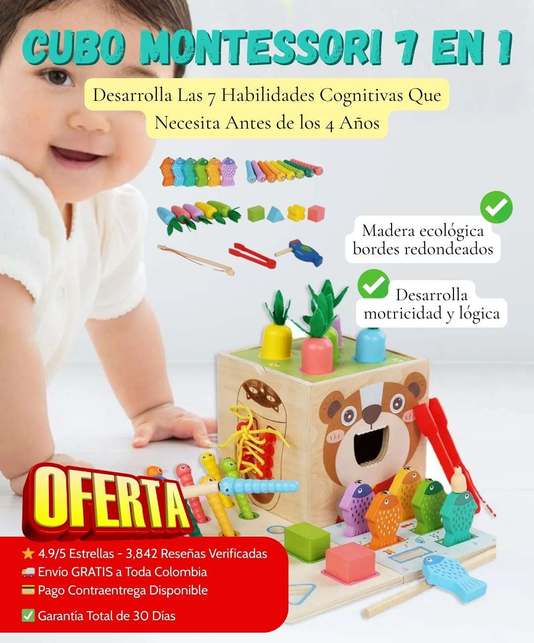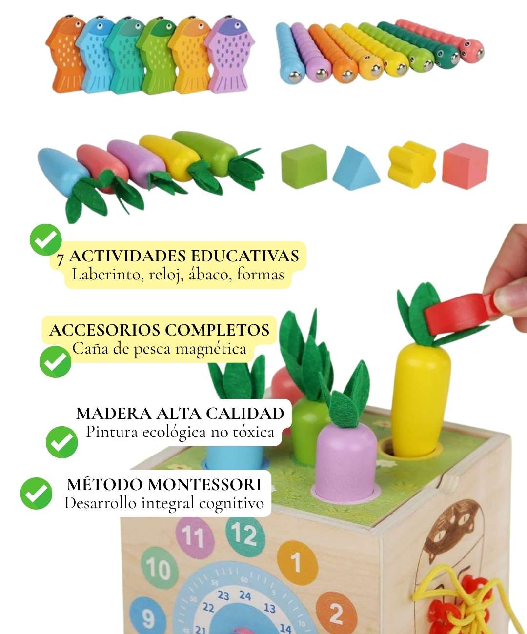 100% seguro. Madera certificada, bordes redondeados, pintura no tóxica. Todas las piezas están diseñadas para evitar riesgo de asfixia. Cumple normas internacionales de seguridad infantil.