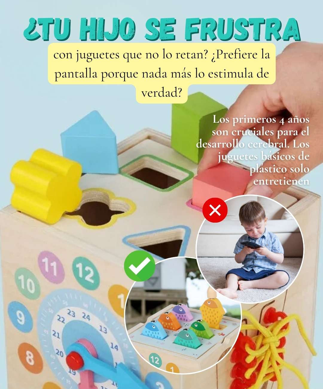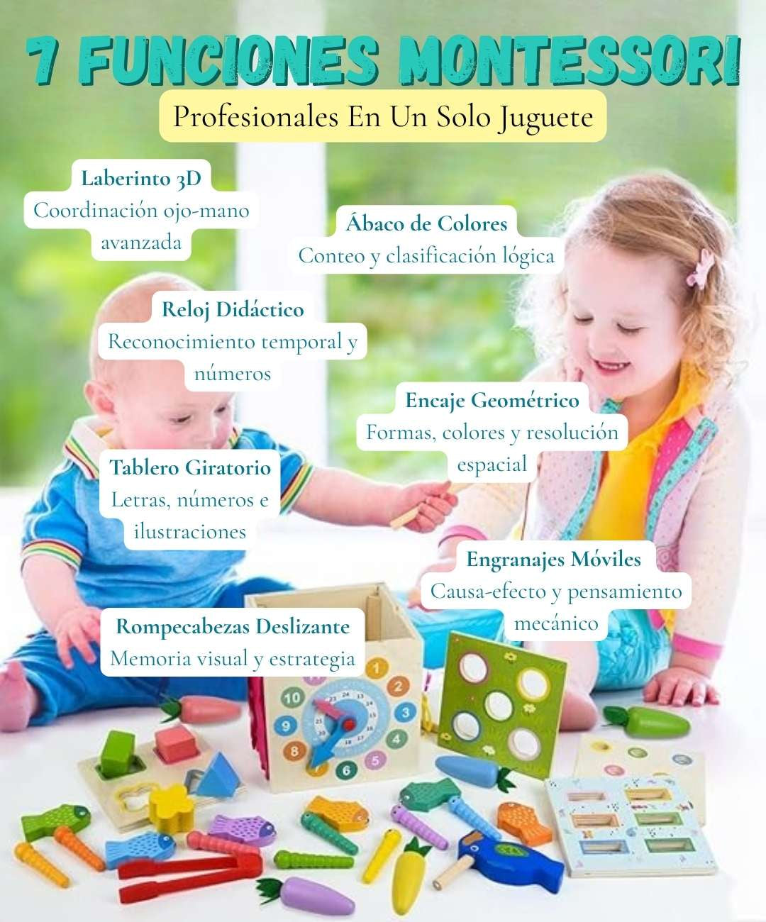 Tu hijo pasa horas explorando las diferentes actividades mientras desarrolla motricidad fina, reconocimiento de colores y formas, coordinación ojo-mano, lógica y concentración.