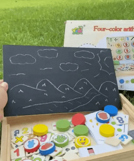 El tablero tiene sistema de apoyo integrado que permite inclinarlo en ángulo estable. Se sostiene solo sin necesidad de apoyarlo contra algo. Esto ayuda a que el niño vea mejor las operaciones.