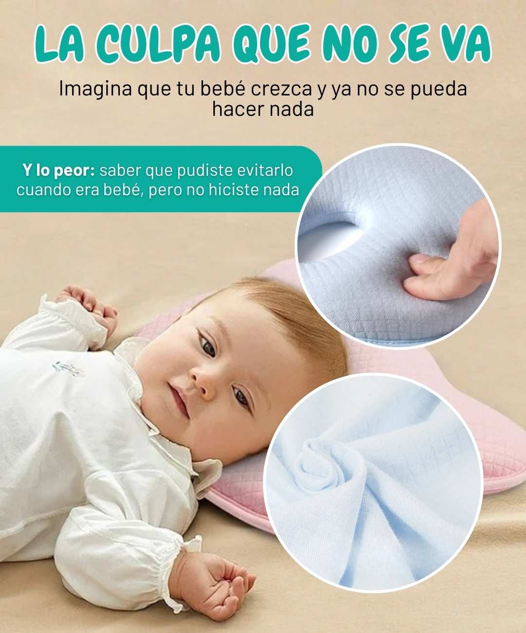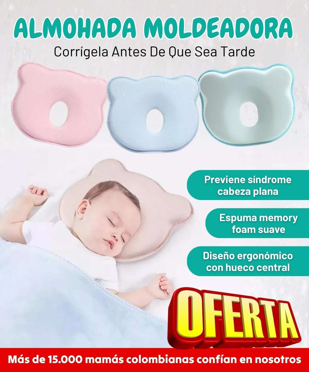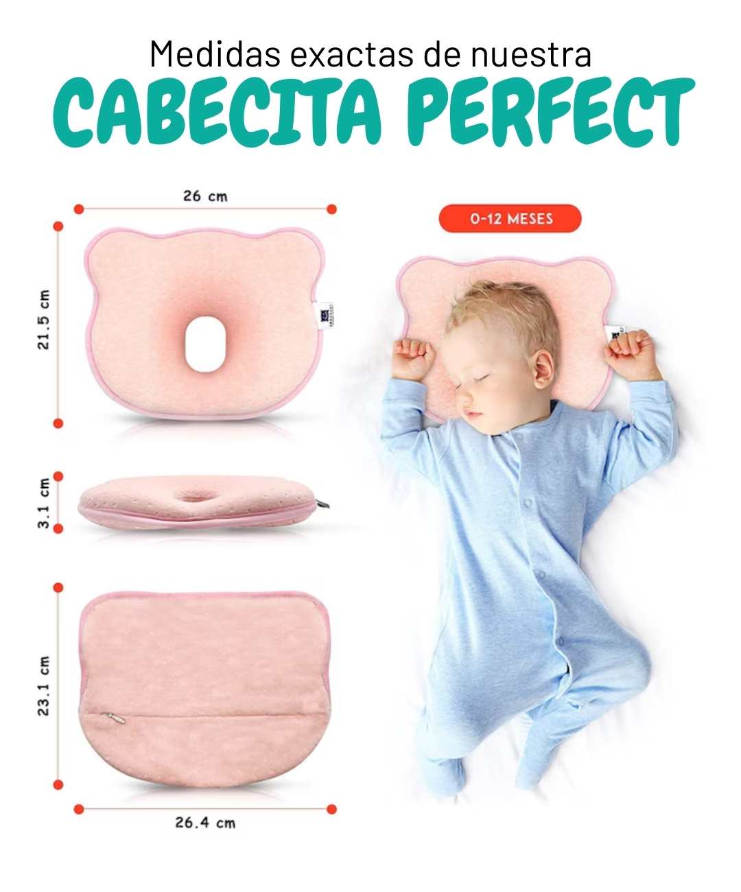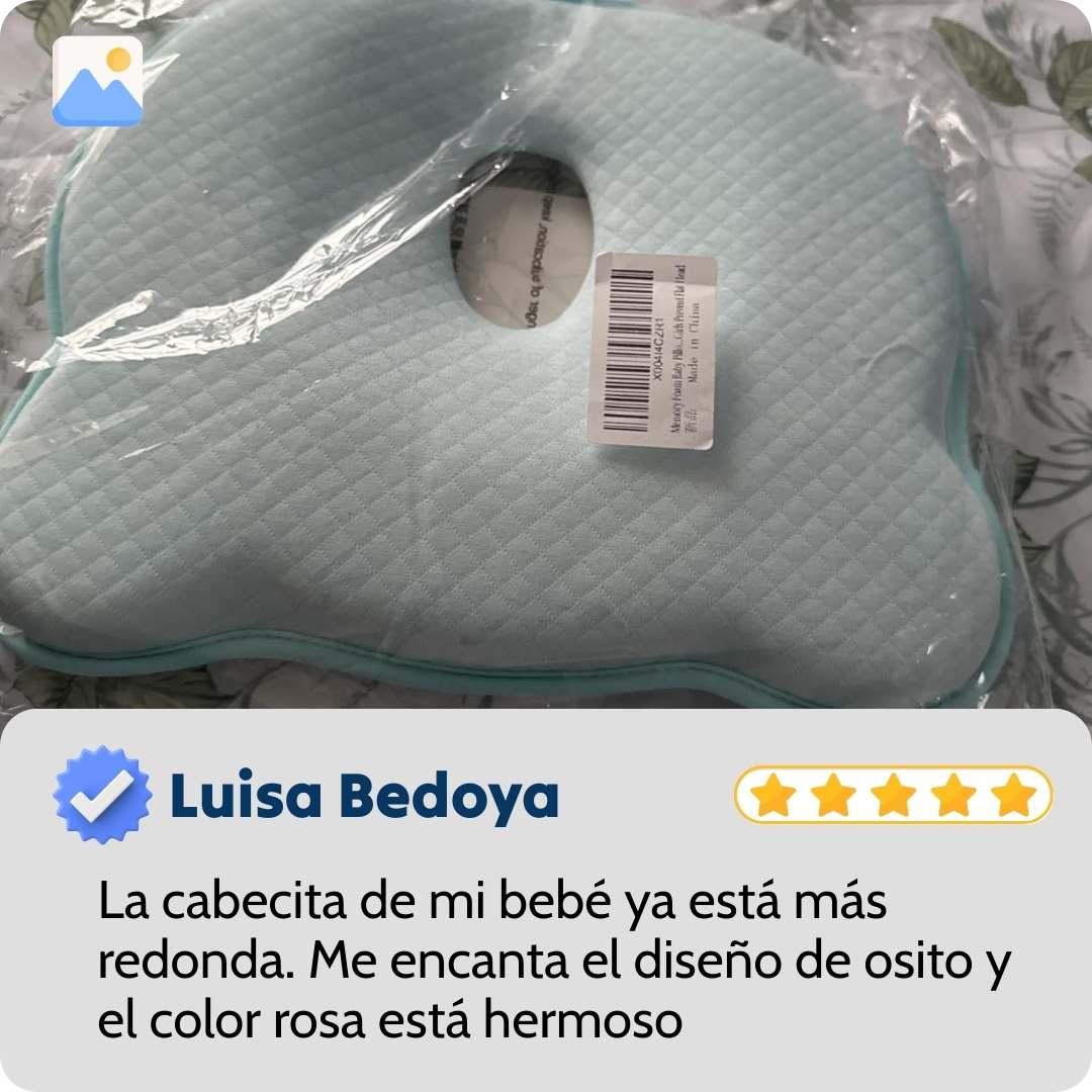 Las dimensiones (25x22x3cm) son ideales para bebés de 0-12 meses. La espuma viscoelástica se adapta perfectamente a cualquier tamaño de cabeza. Si por alguna razón no funciona, tienes 30 días de garantía.
