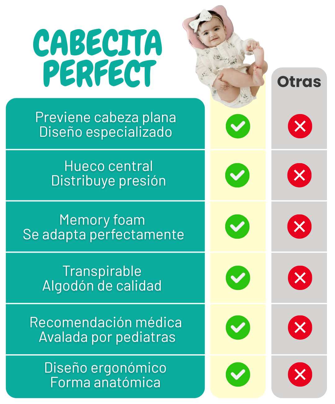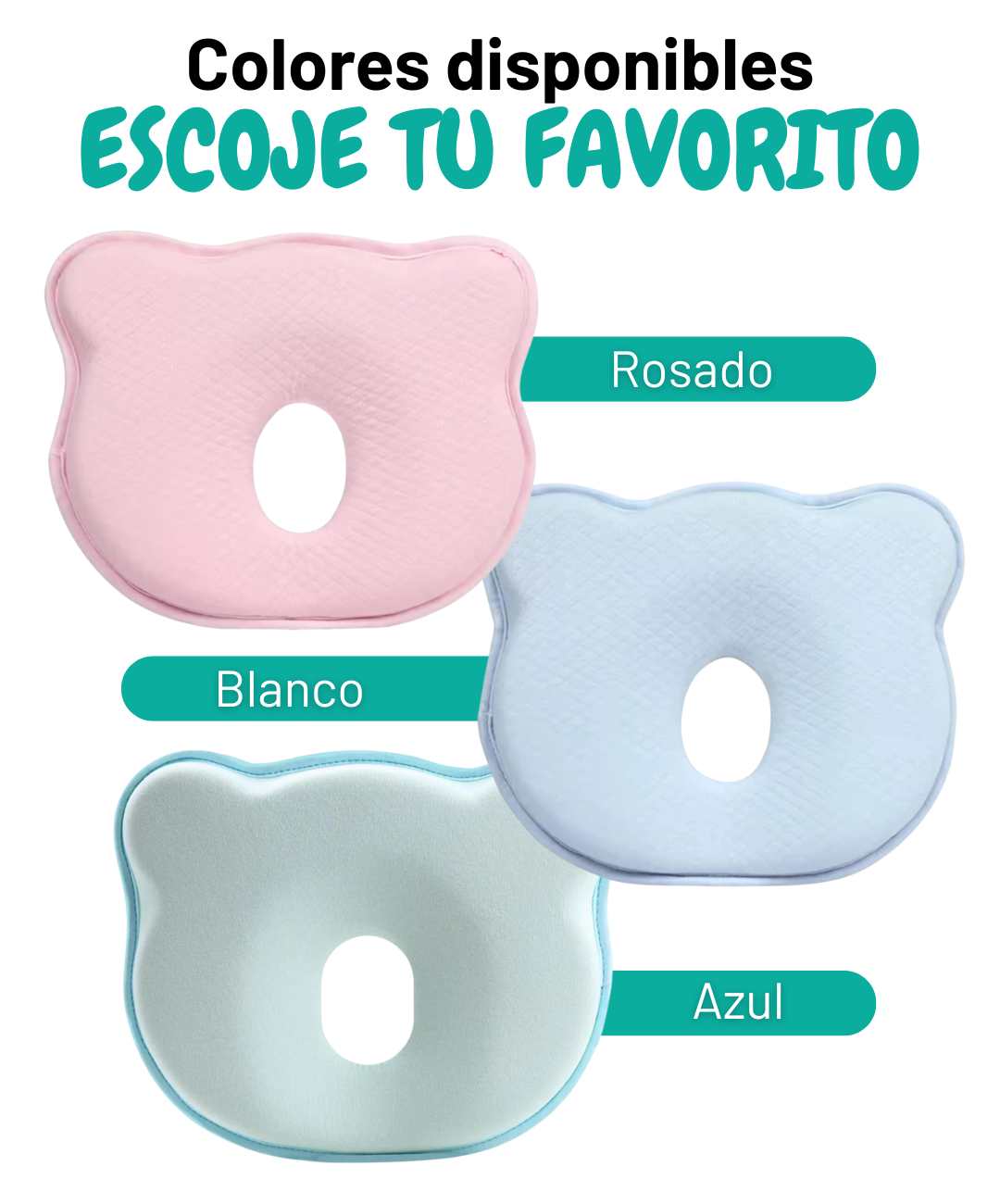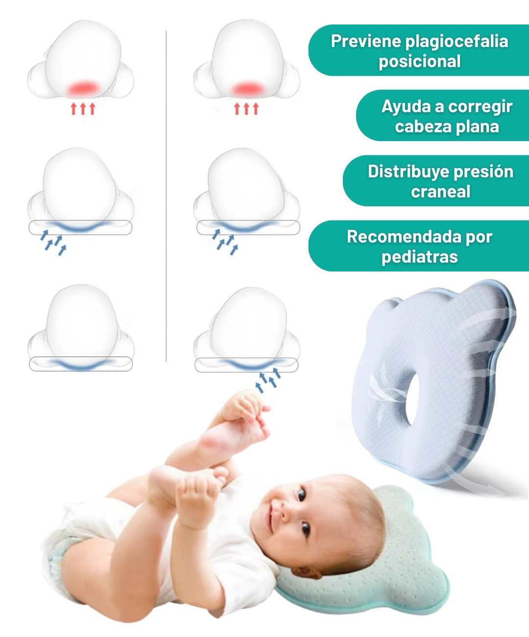 La espuma memory foam se adapta suavemente mientras distribuye la presión de forma pareja, ayudando a prevenir o corregir el síndrome de cabeza plana (plagiocefalia). Recomendada por pediatras para uso supervisado.
