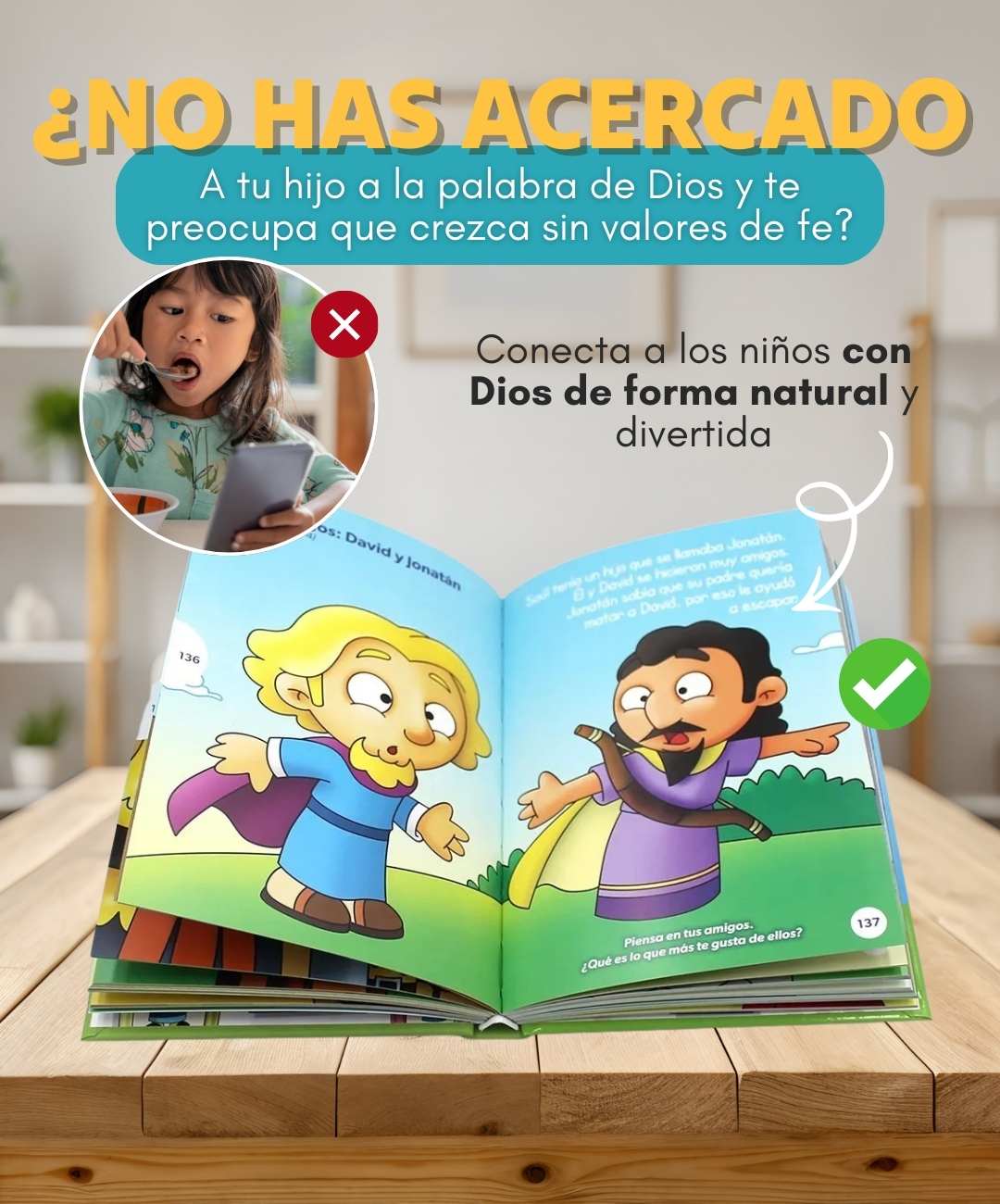 Sí. Está diseñada para niños de 4 a 10 años. El lenguaje es simple pero profundo, las ilustraciones capturan su atención y las historias están resumidas para sesiones de 10-15 minutos. Perfecta para lectura nocturna o devocional familiar.