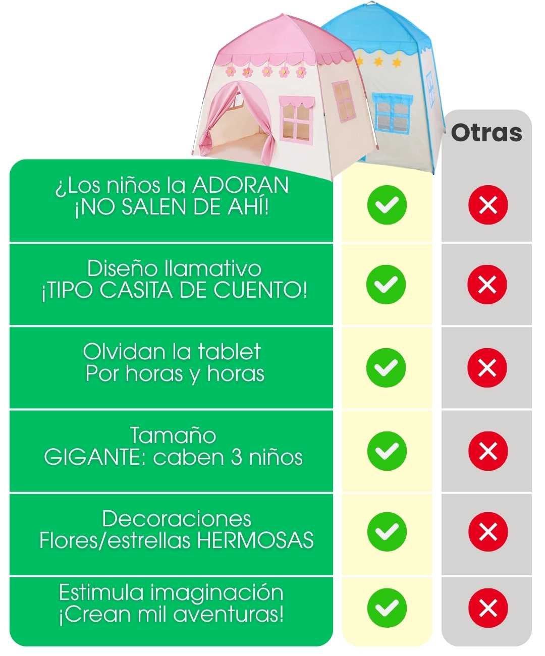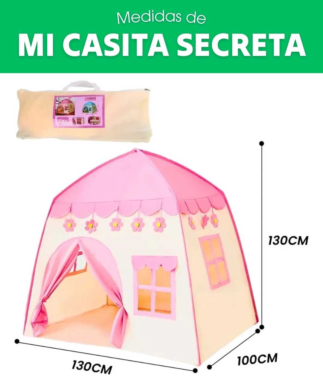 Incluye: La carpa completa en el color elegido (rosado o azul), 4 varillas reforzadas para estructura estable, y bolsa de transporte. Todo lo necesario para armar y disfrutar de inmediato.
