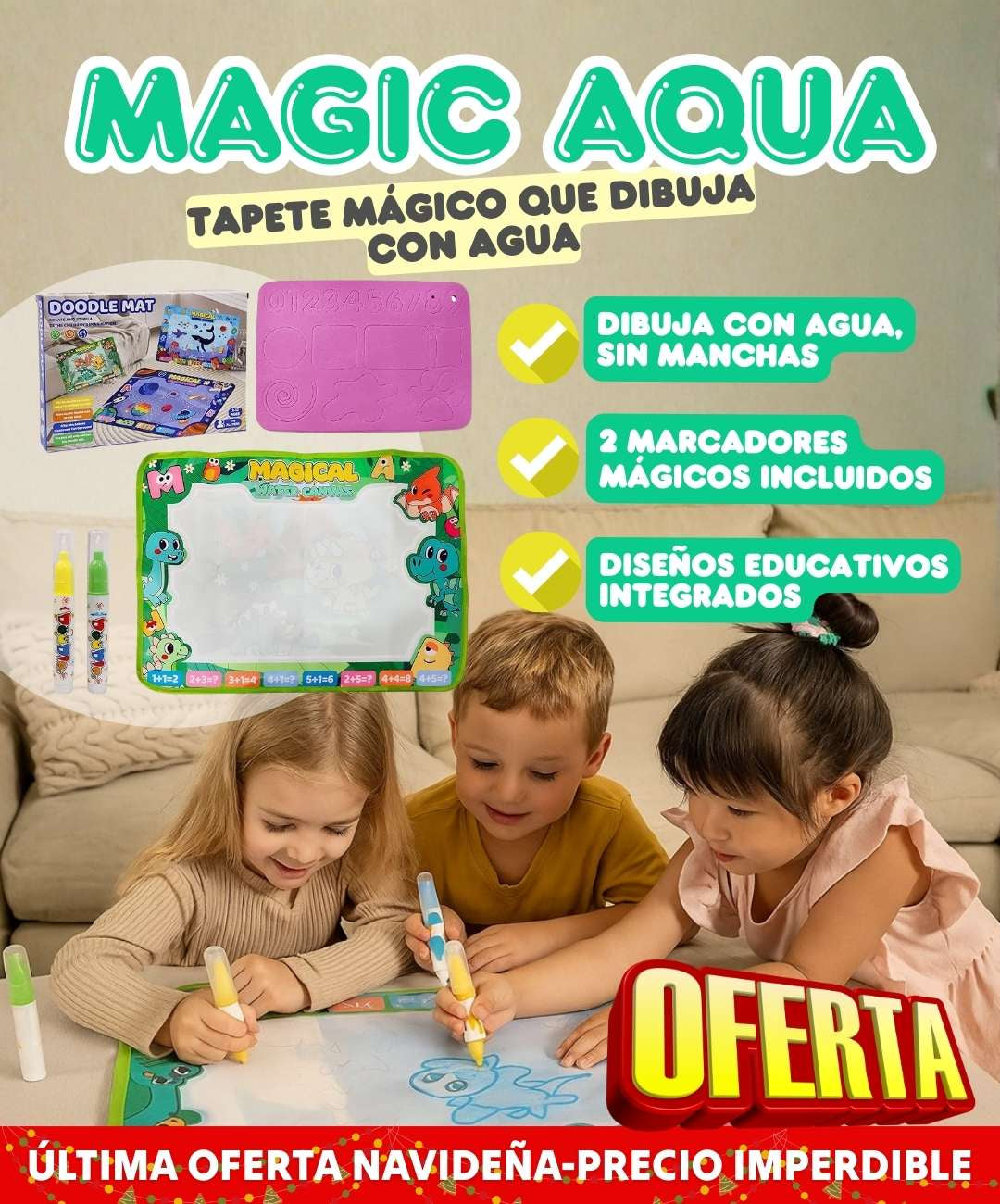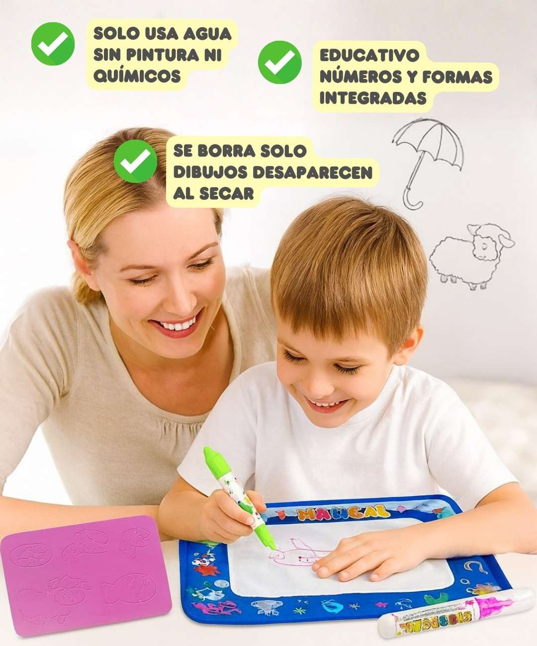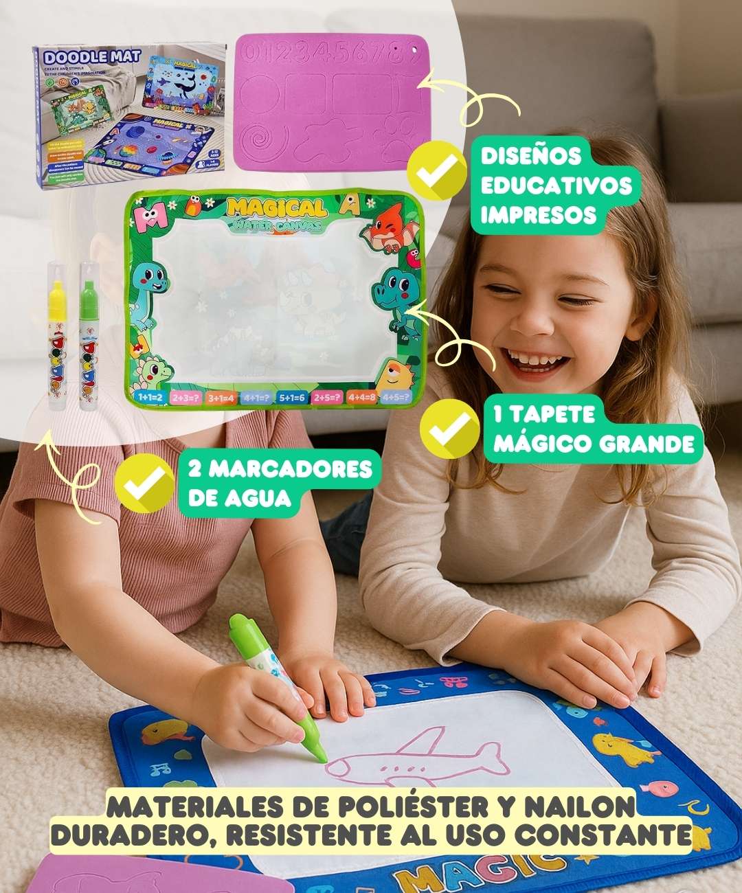 Este tapete revolucionario funciona únicamente con agua. Los niños dibujan con los marcadores mágicos llenos de agua y los trazos aparecen de colores en el tapete.
